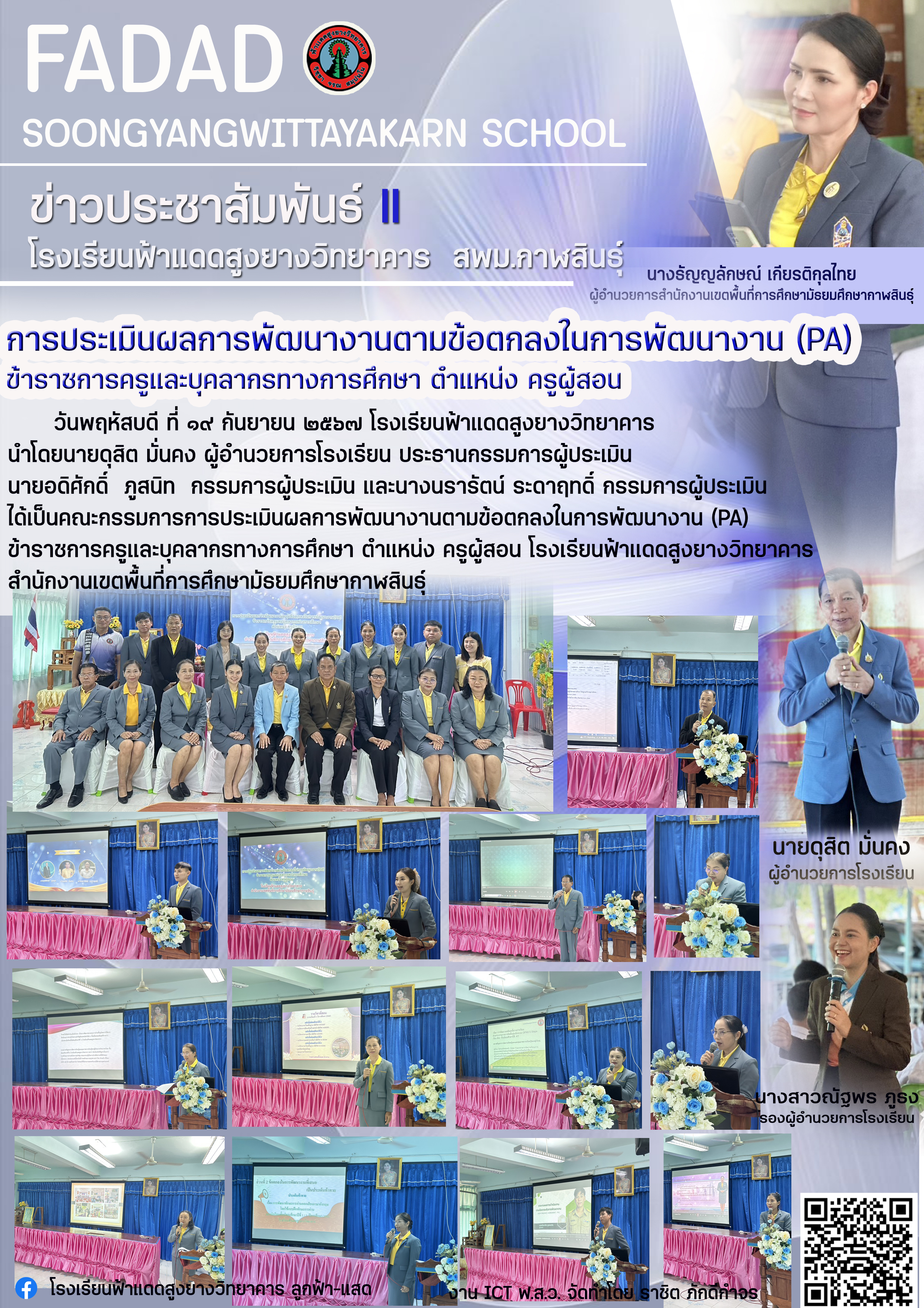 ข่าวประชาสัมพันธ์ โรงเรียนฟ้าแดดสูงยางวิทยาคาร เรื่อง การประเมินผลการพัฒนางานตามข้อตกลงในการพัฒนางาน (PA) ข้าราซการครูและบุคลาครทางการศึกษา ตำแหน่ง ครูผู้สอน